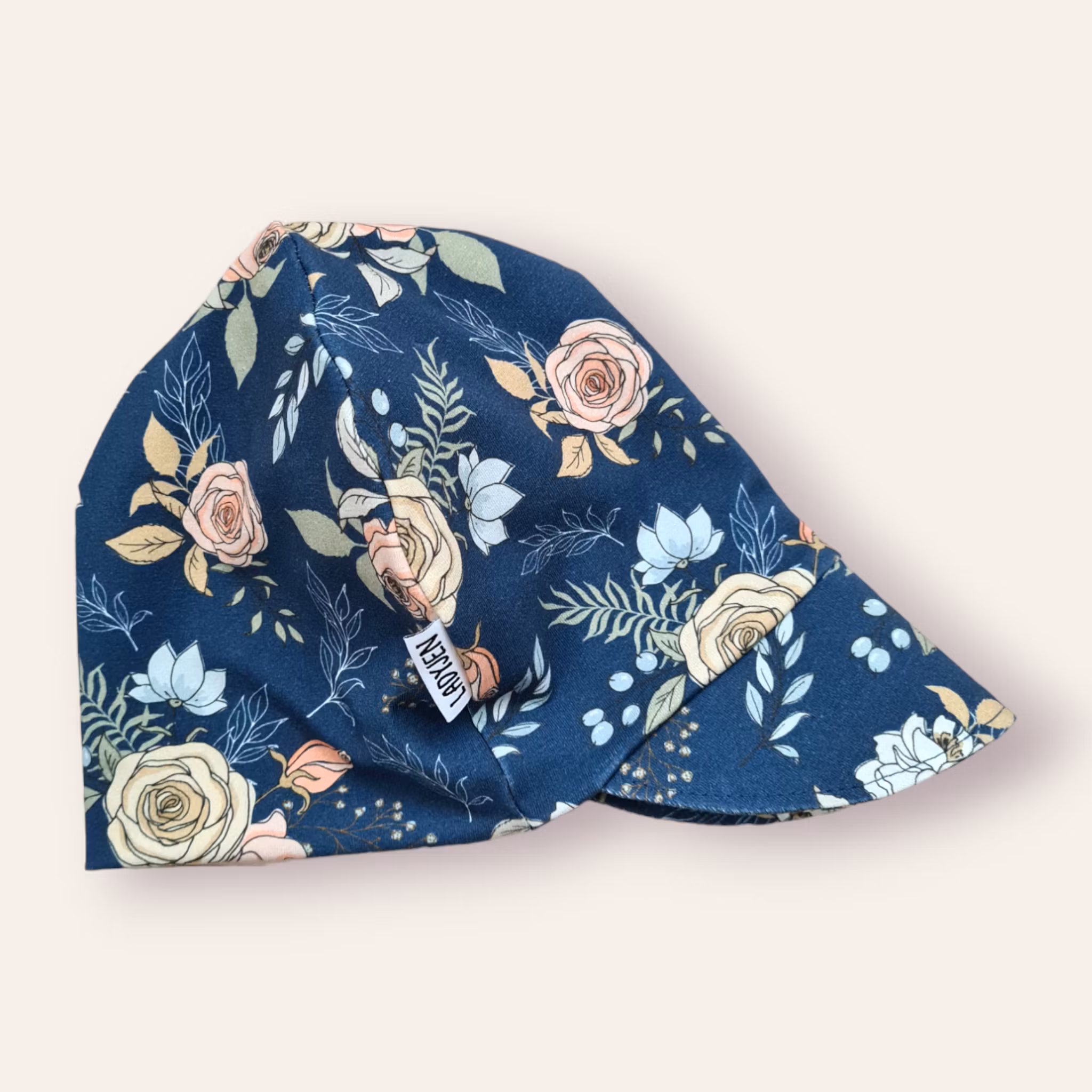 Den här mepsen är blå med blommönster i rosa, grönt, beige och ljusblått.