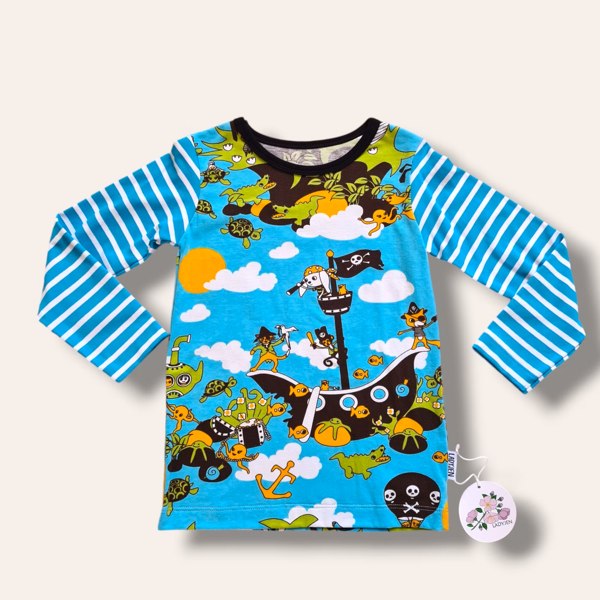 Blå tröja med pirat-motiv på fram- och bakstycket, turkos/vit randiga ärmar och svart kantband.