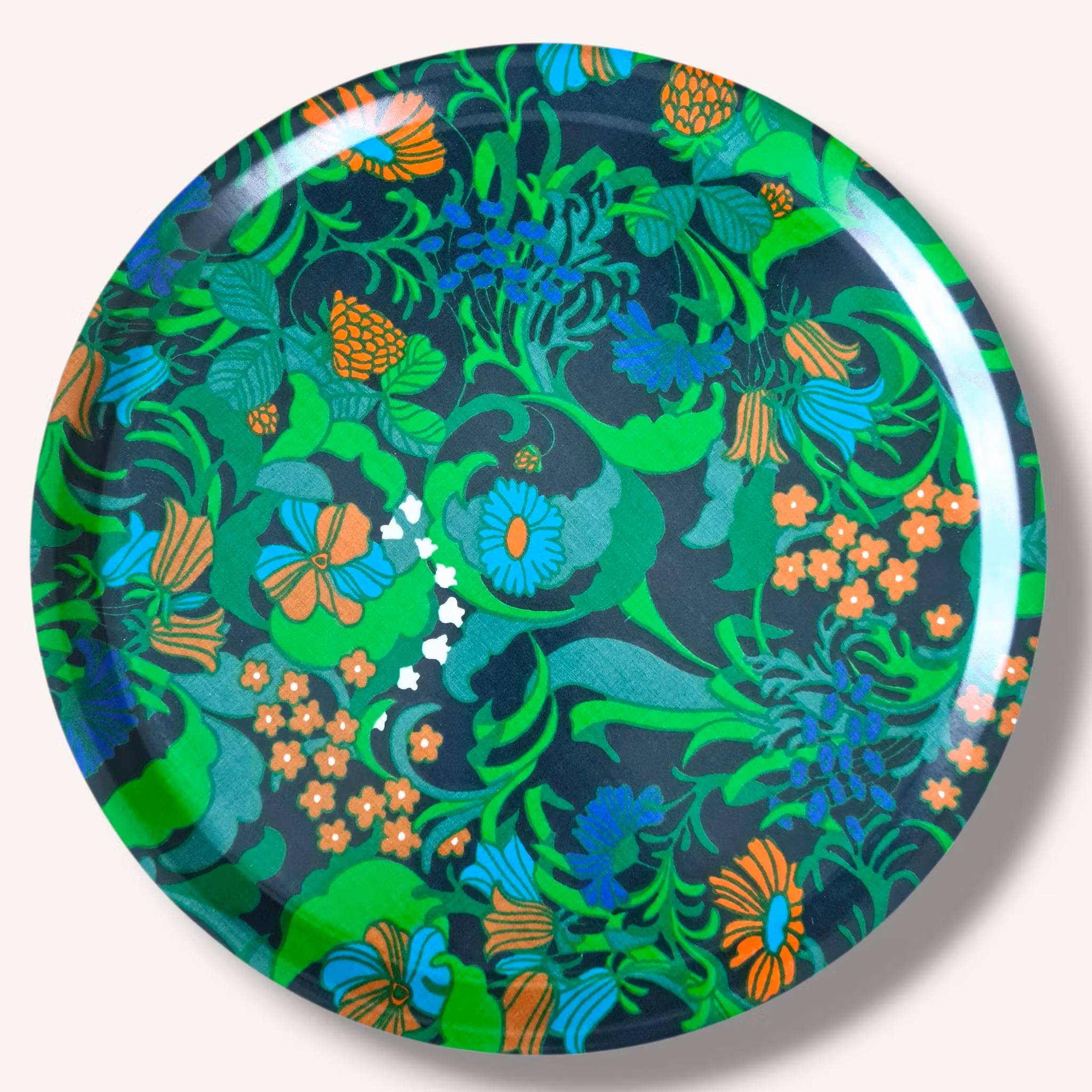 Retrobricka i grönt med blommönster i olika blå, gröna och orange toner.