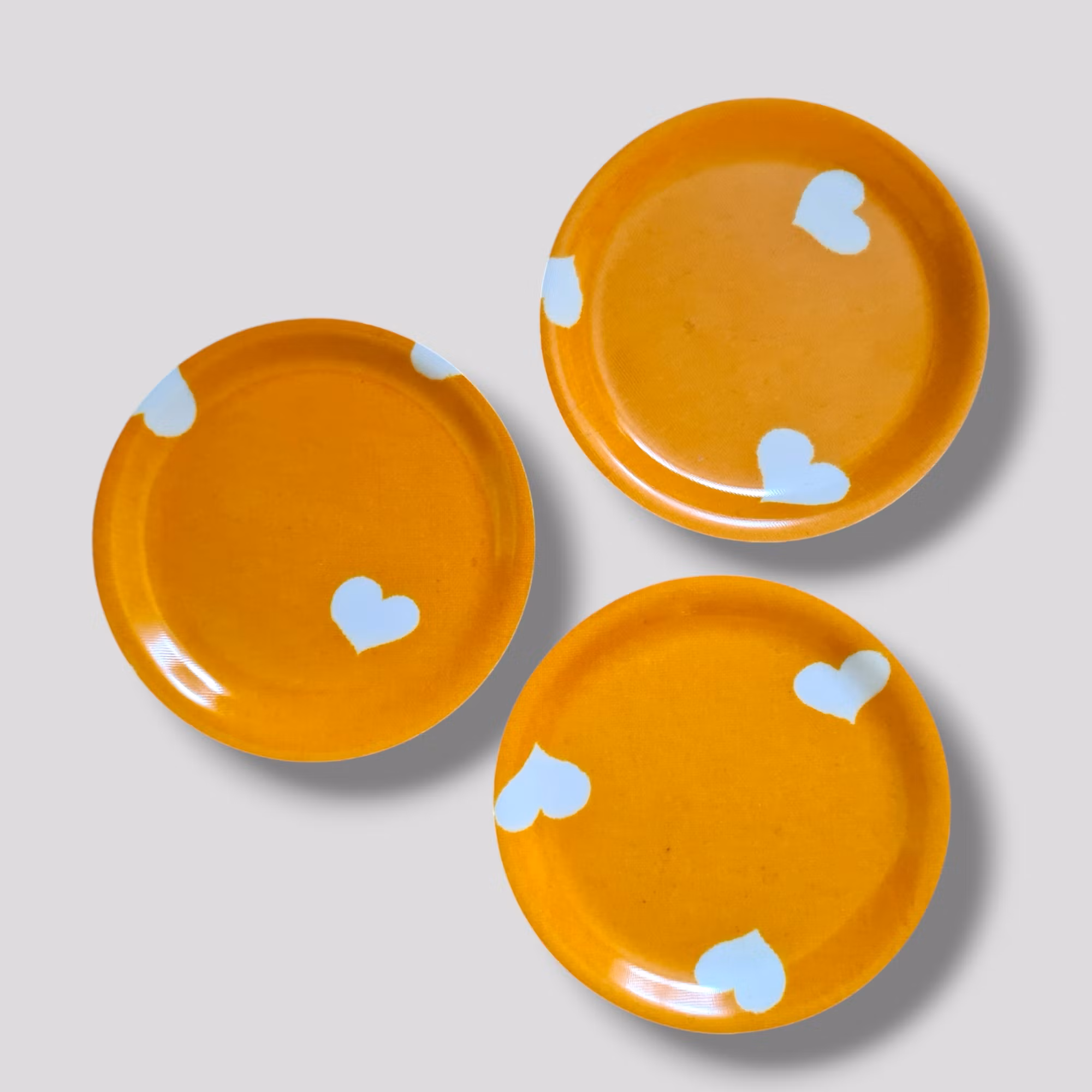 3-pack med glasunderlägg, orange med vita små hjärtan. Något dammiga i tyget.