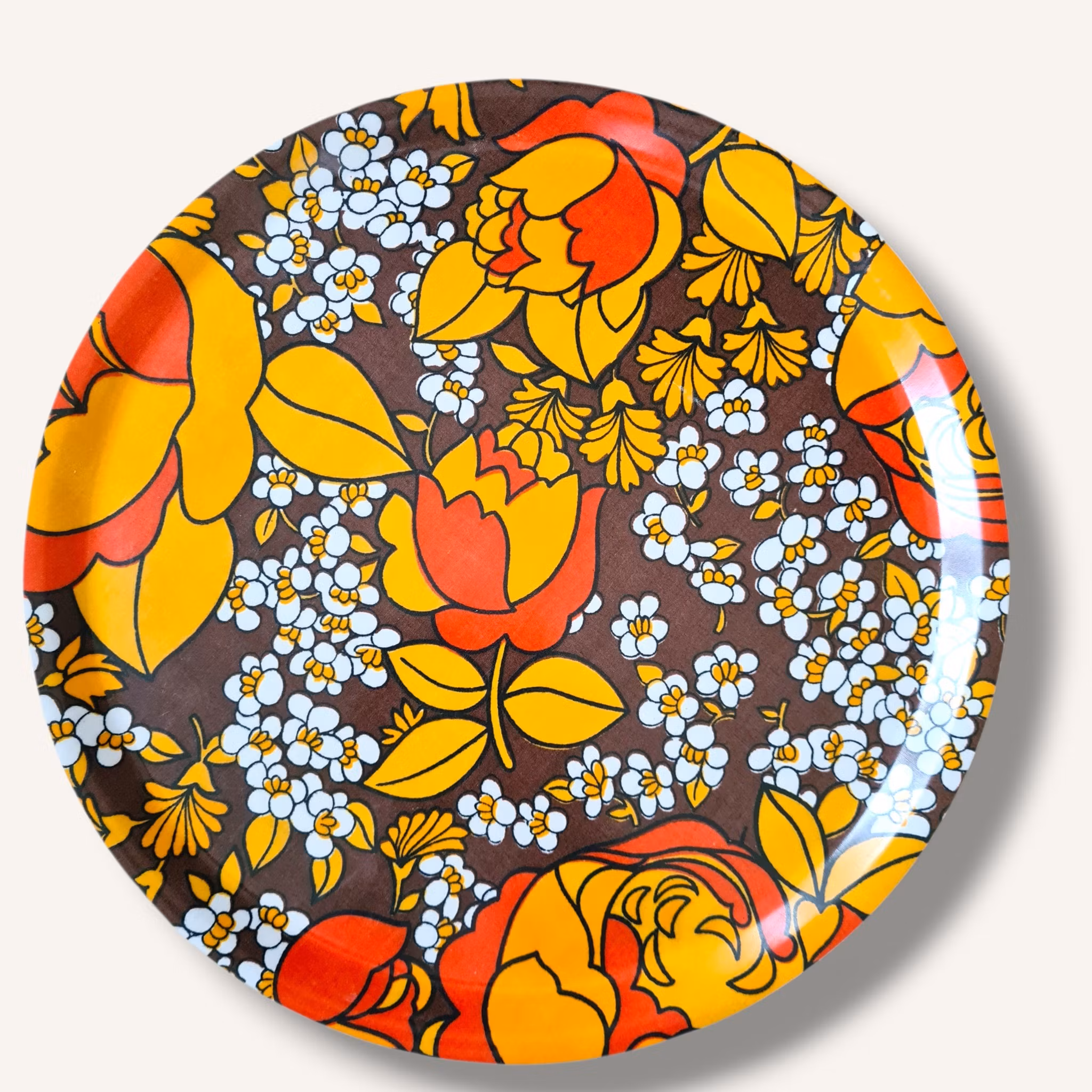 Retrobricka i brunt med blommor i vitt och olika orange toner.