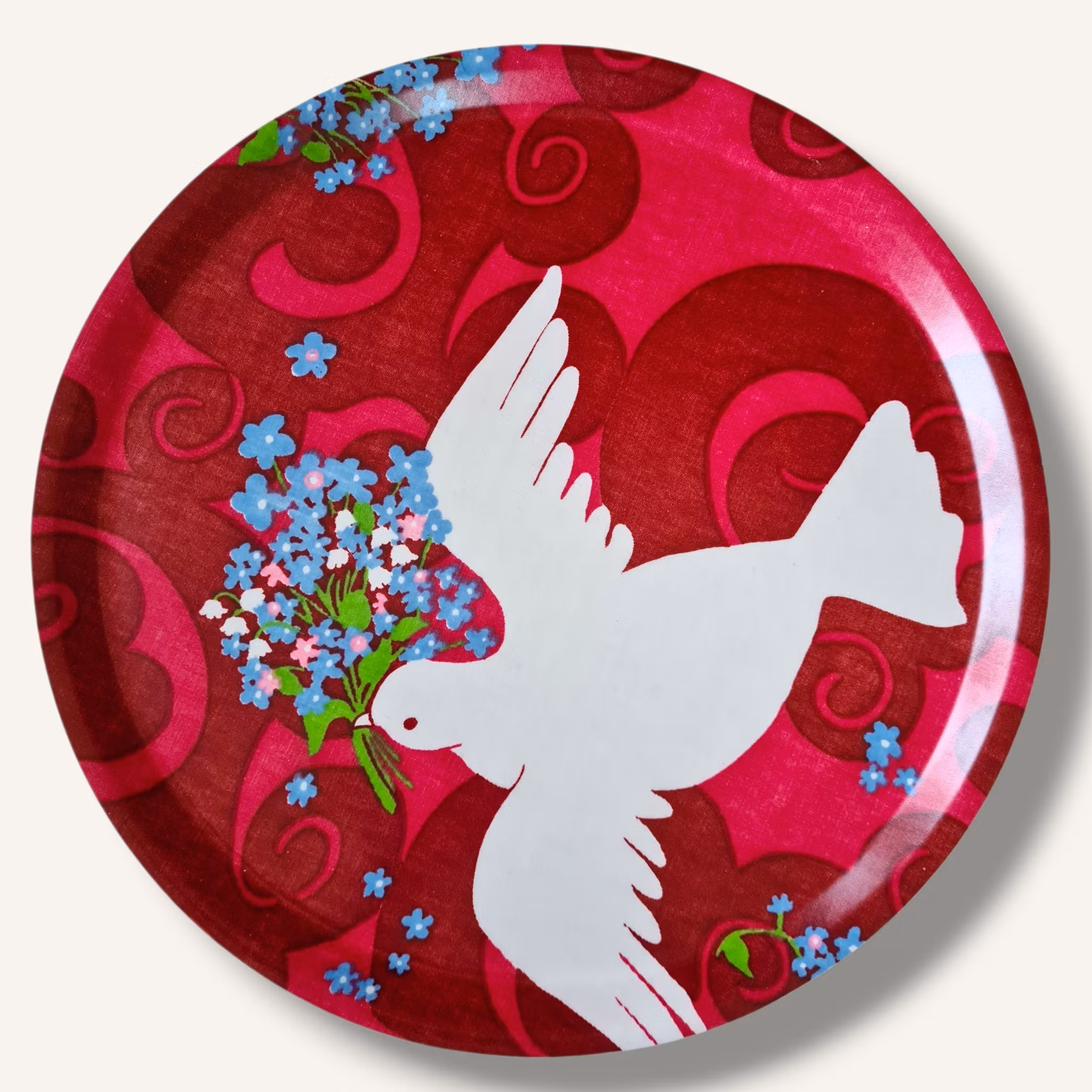 Retrobricka i cerise med en vit duva och småblommor i blått.