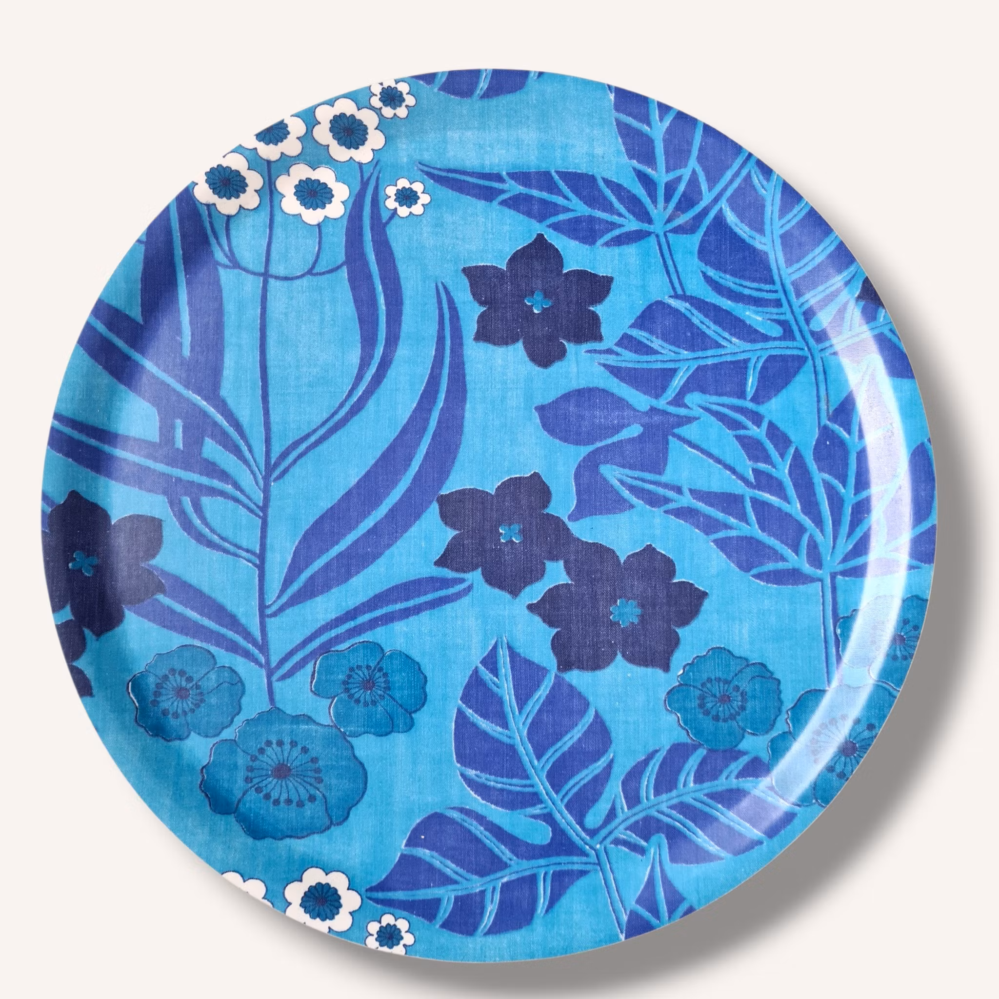 Retrobricka i blått med blommor och blad i vitt och blått.