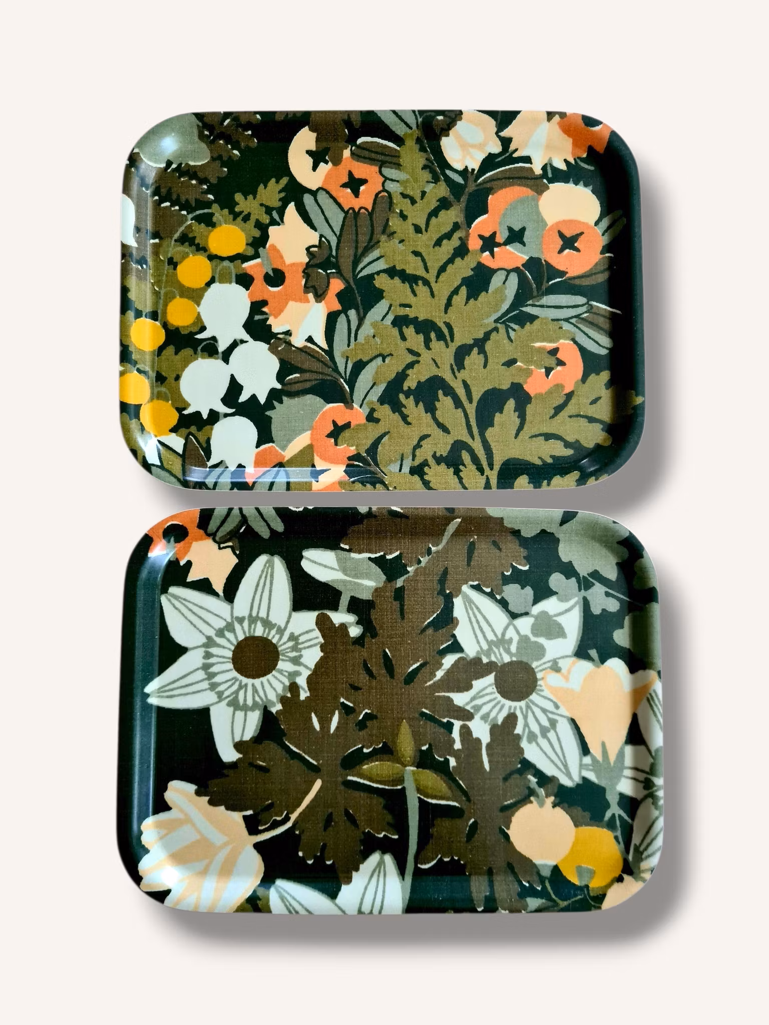 Två retrobrickor i brunt med blommönster i olika bruna, gula och vita toner.