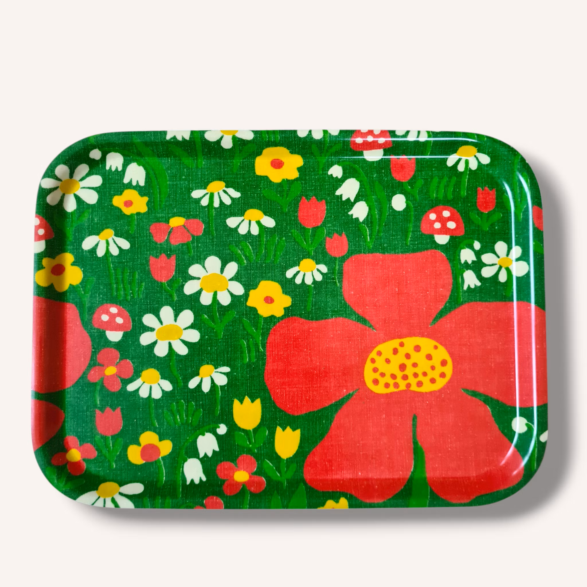 Retrobricka i retrotyget Hilma, grön med mönster i rött, gult och vitt.