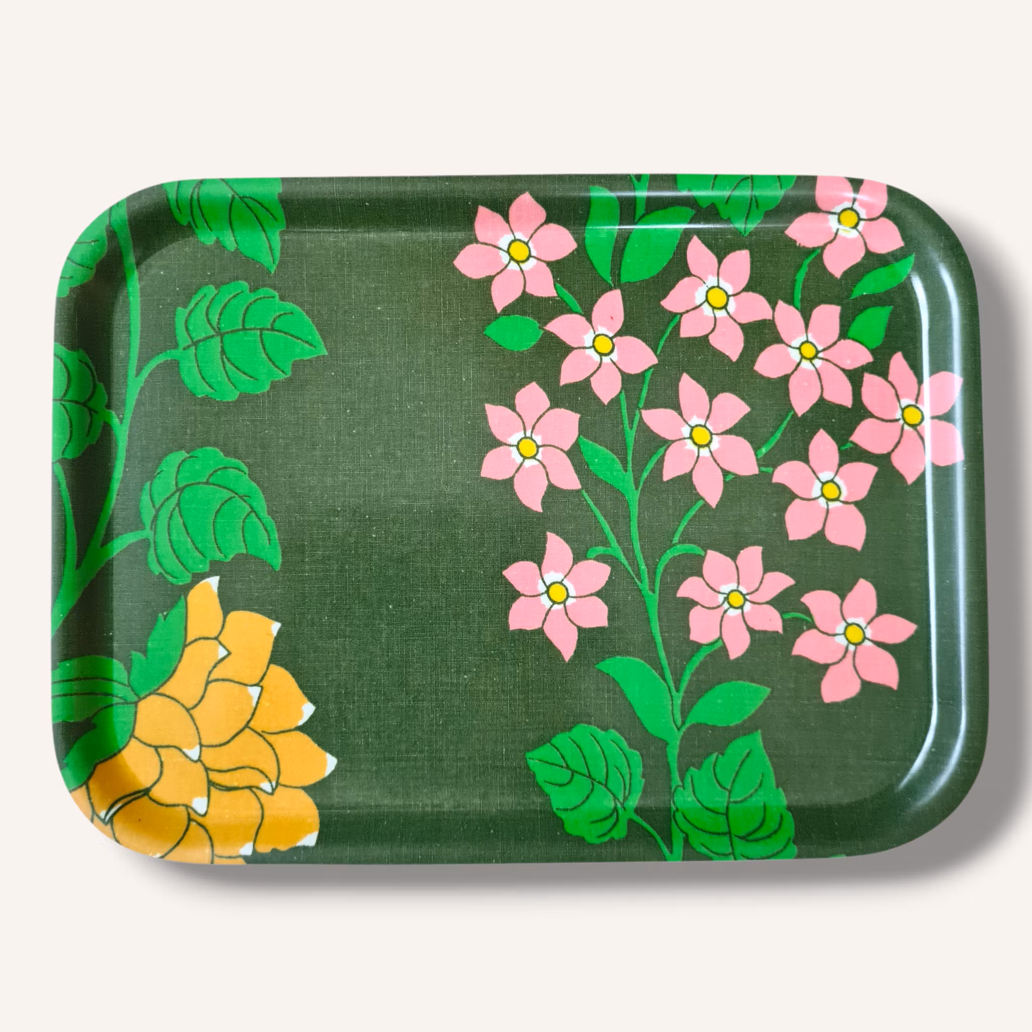 Grön skärbräda med blommönster i grönt, rosa och orange.