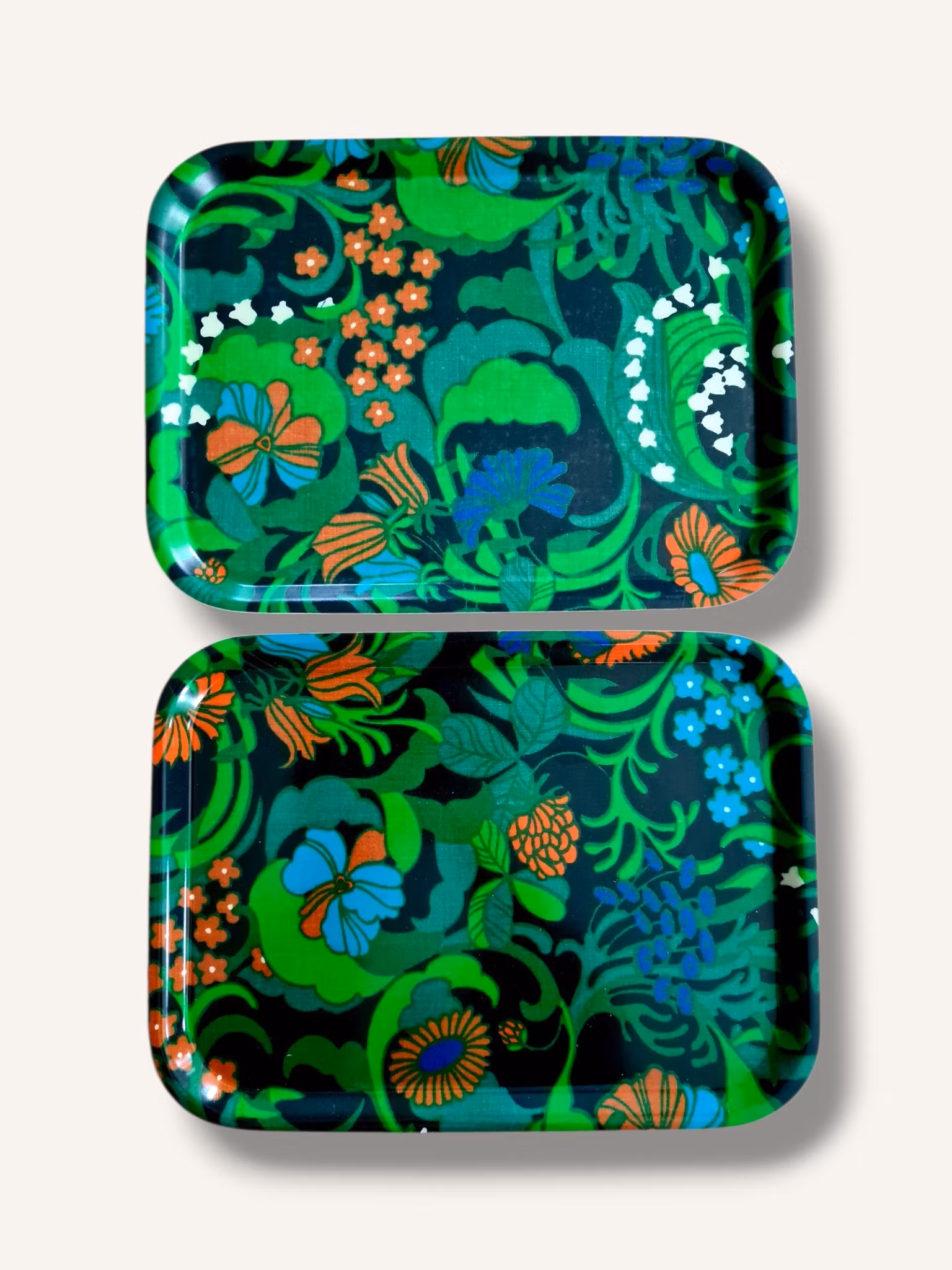 Två retrobrickor i grönt med blommönster i grönt, orange, vitt och blått.
