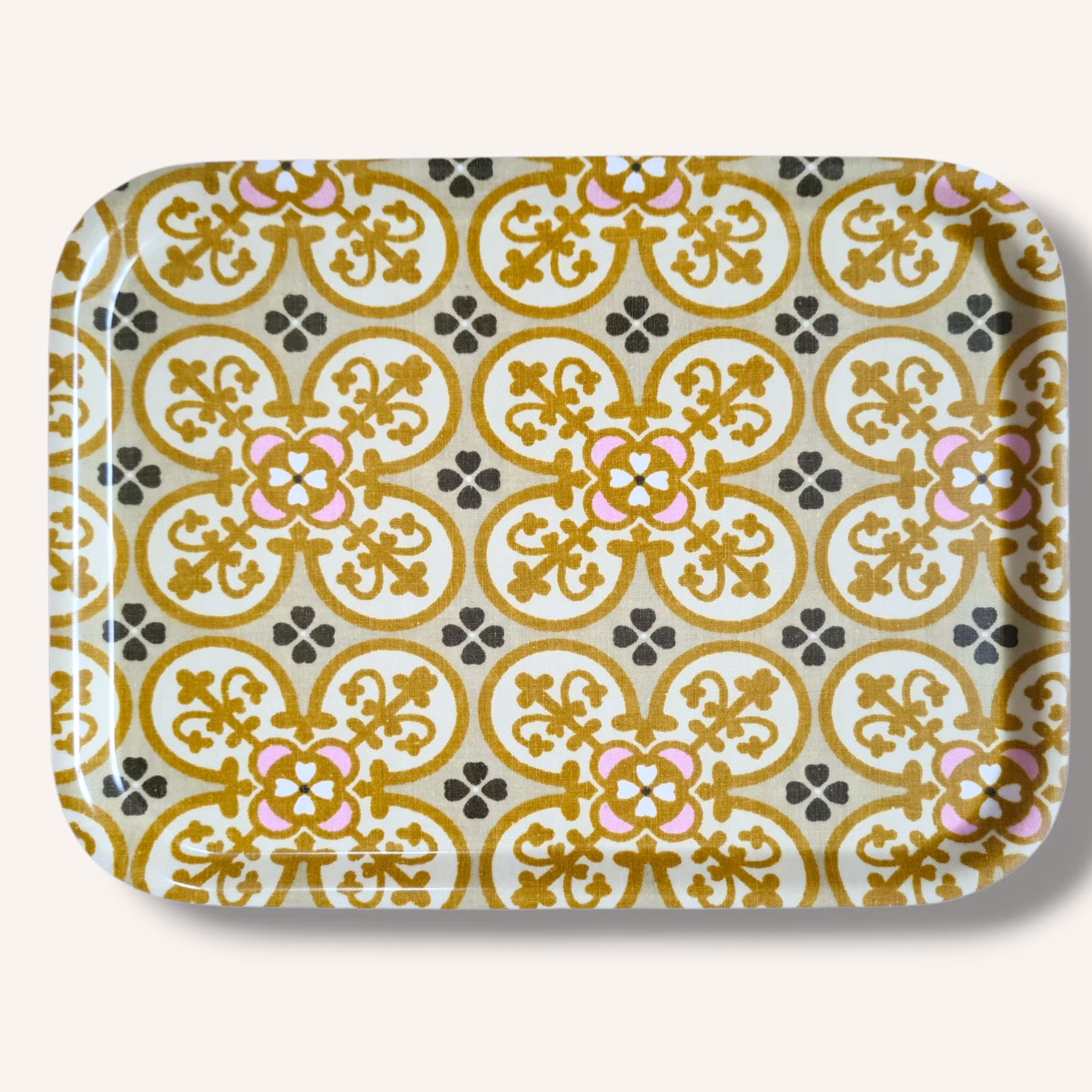 Retrobricka i blommönster i rosa och olika gula nyanster.