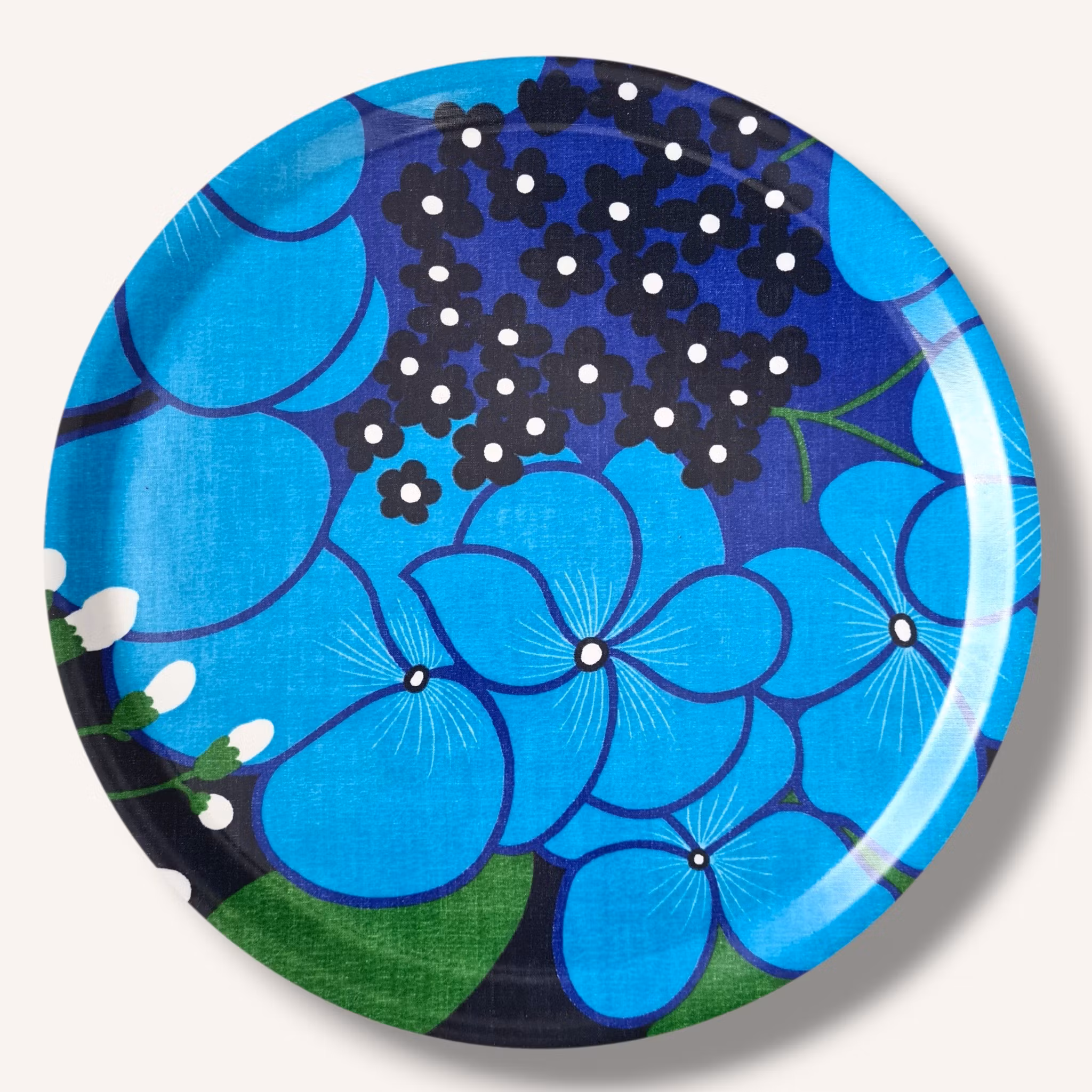 Retrobricka i blått med blommönster i olika blå nyanser och gröna blad.