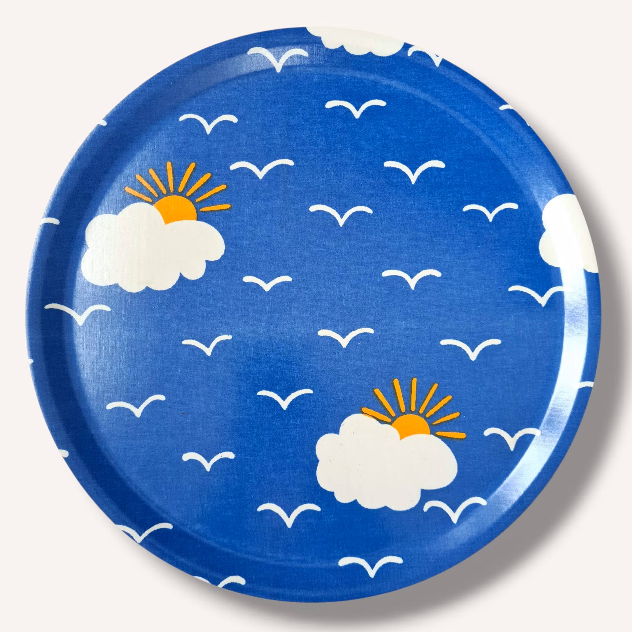 Retrobricka i blått med moln och fåglar i vitt, gula solar.