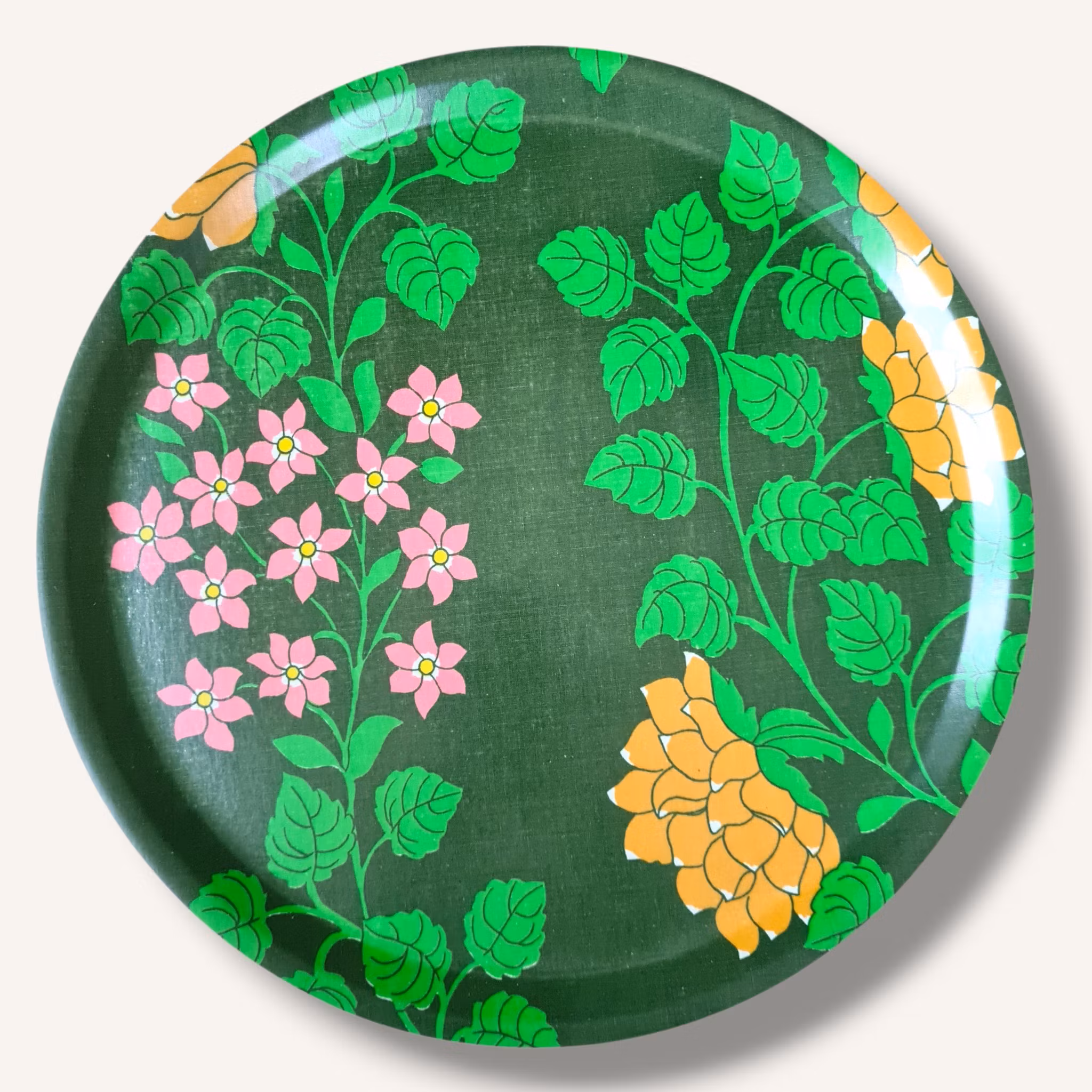 Retrobricka i grönt med blommönster i rosa, orange och grönt.