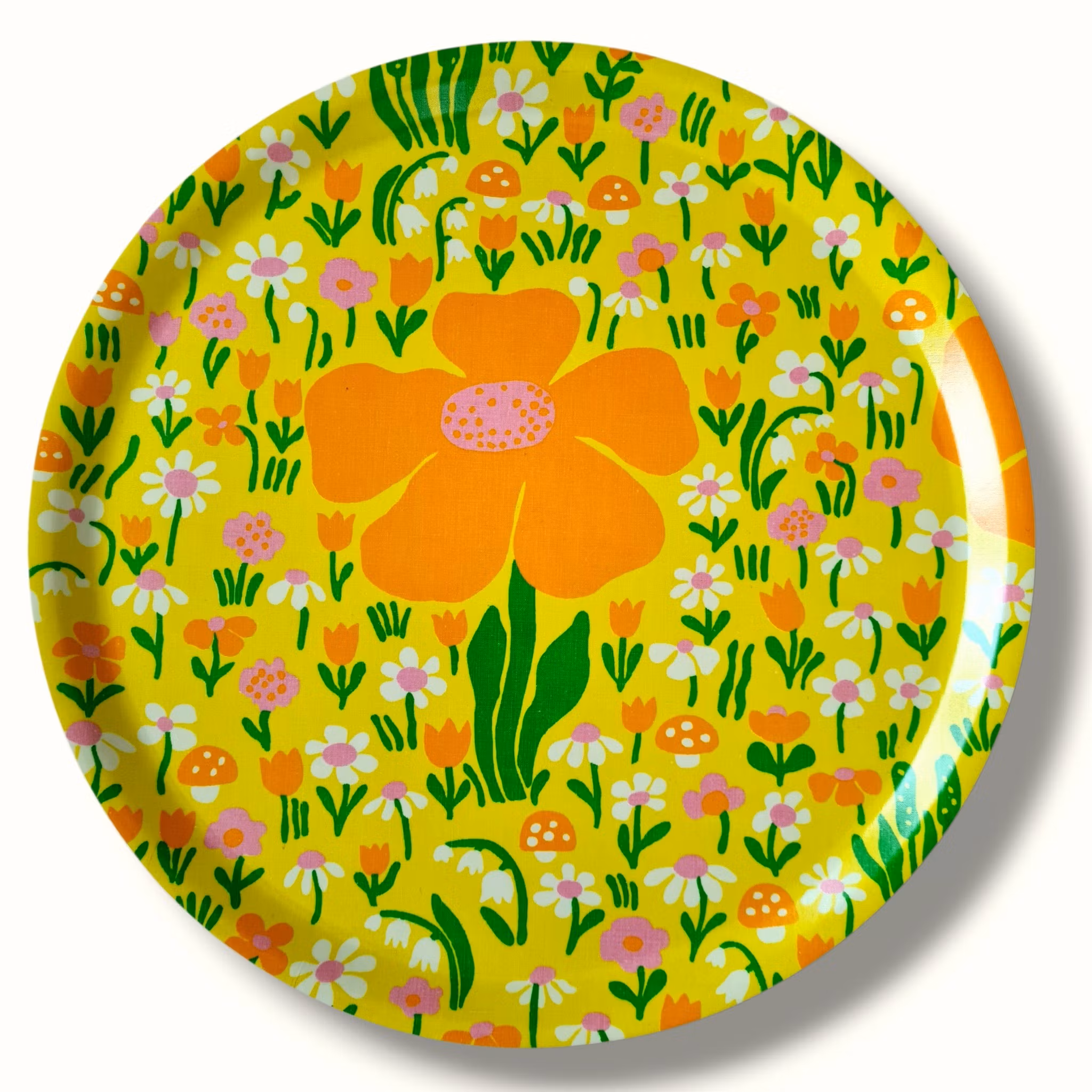 Retrobricka i tyget Hilma, gul med mönster i orange, rosa, vitt och grönt.