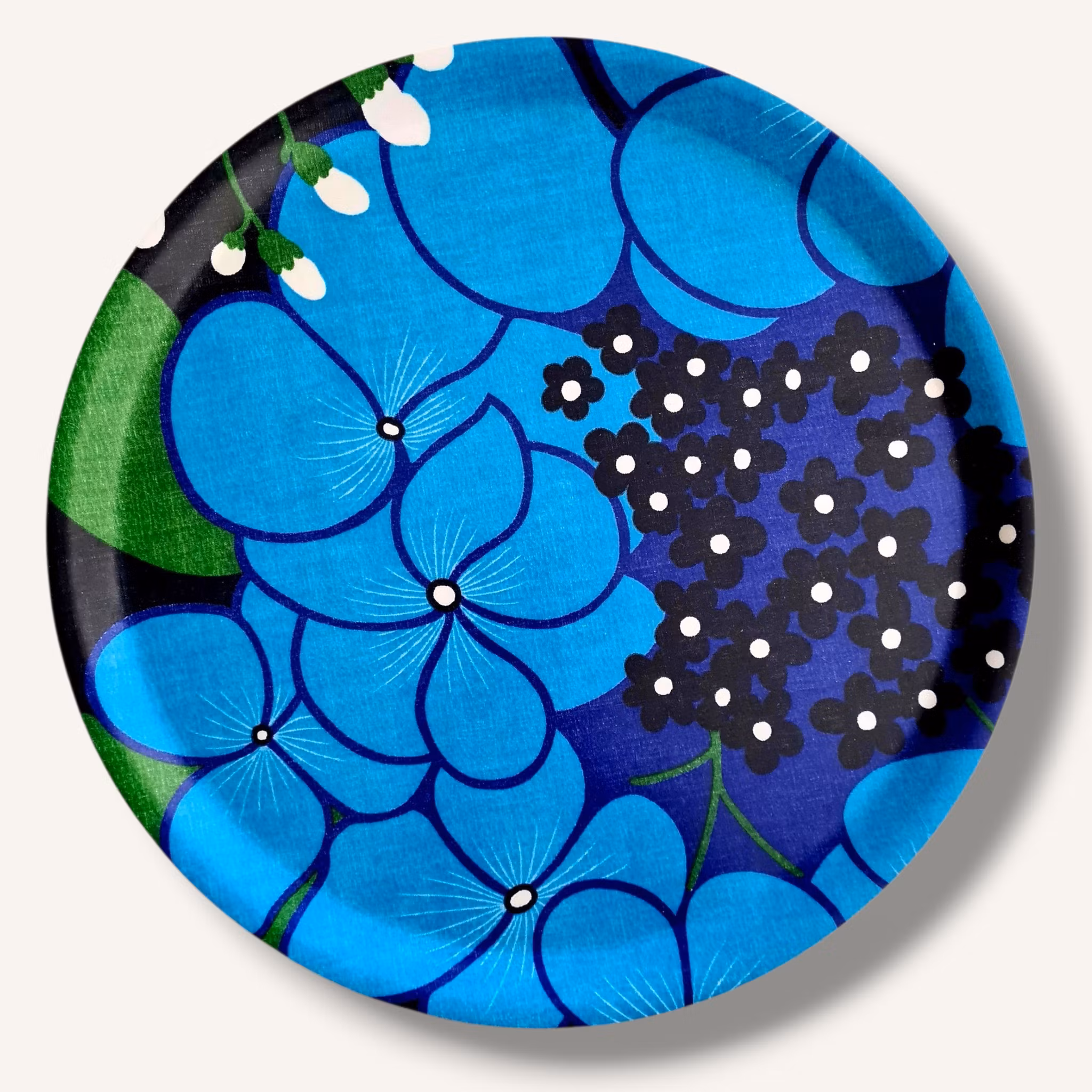 Retrobricka i blått med blommönster i olika blå nyanser och gröna blad.