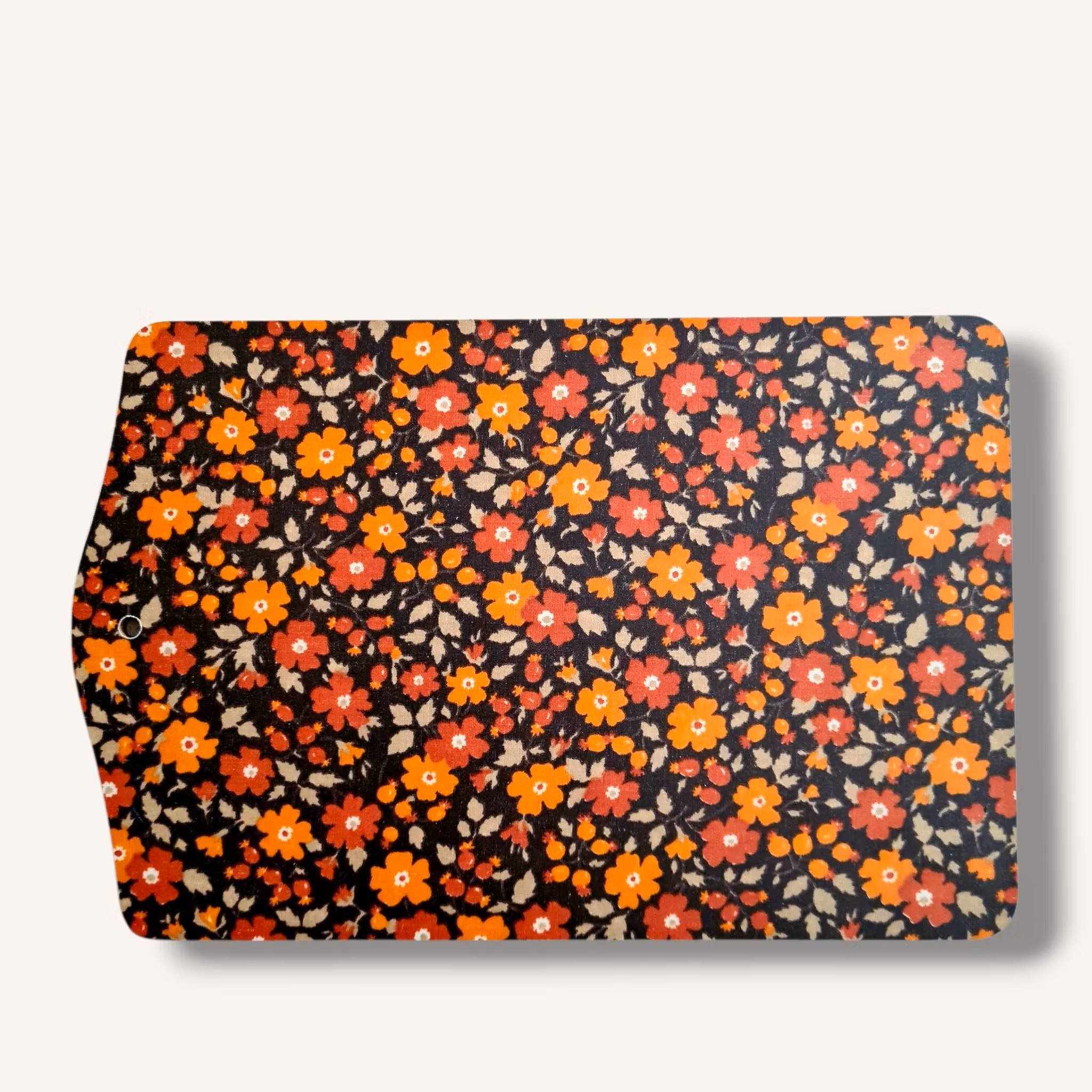 Brun skärbräda med smått blommönster i olika orange toner och beige