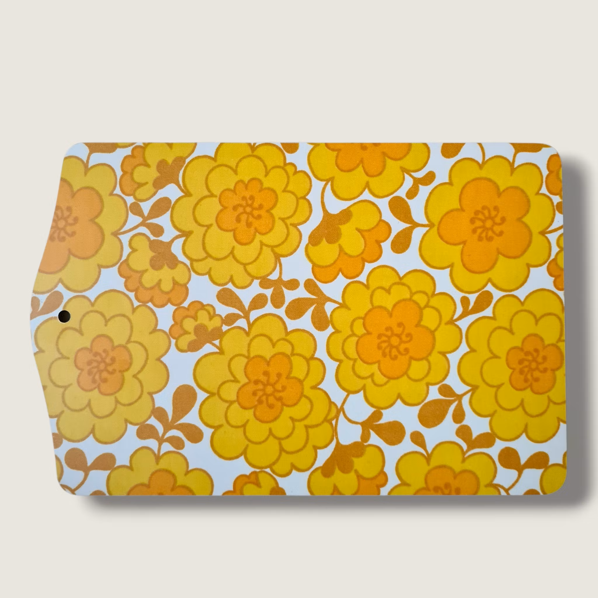 Gul skärbräda med blommönster i olika gula nyanser.