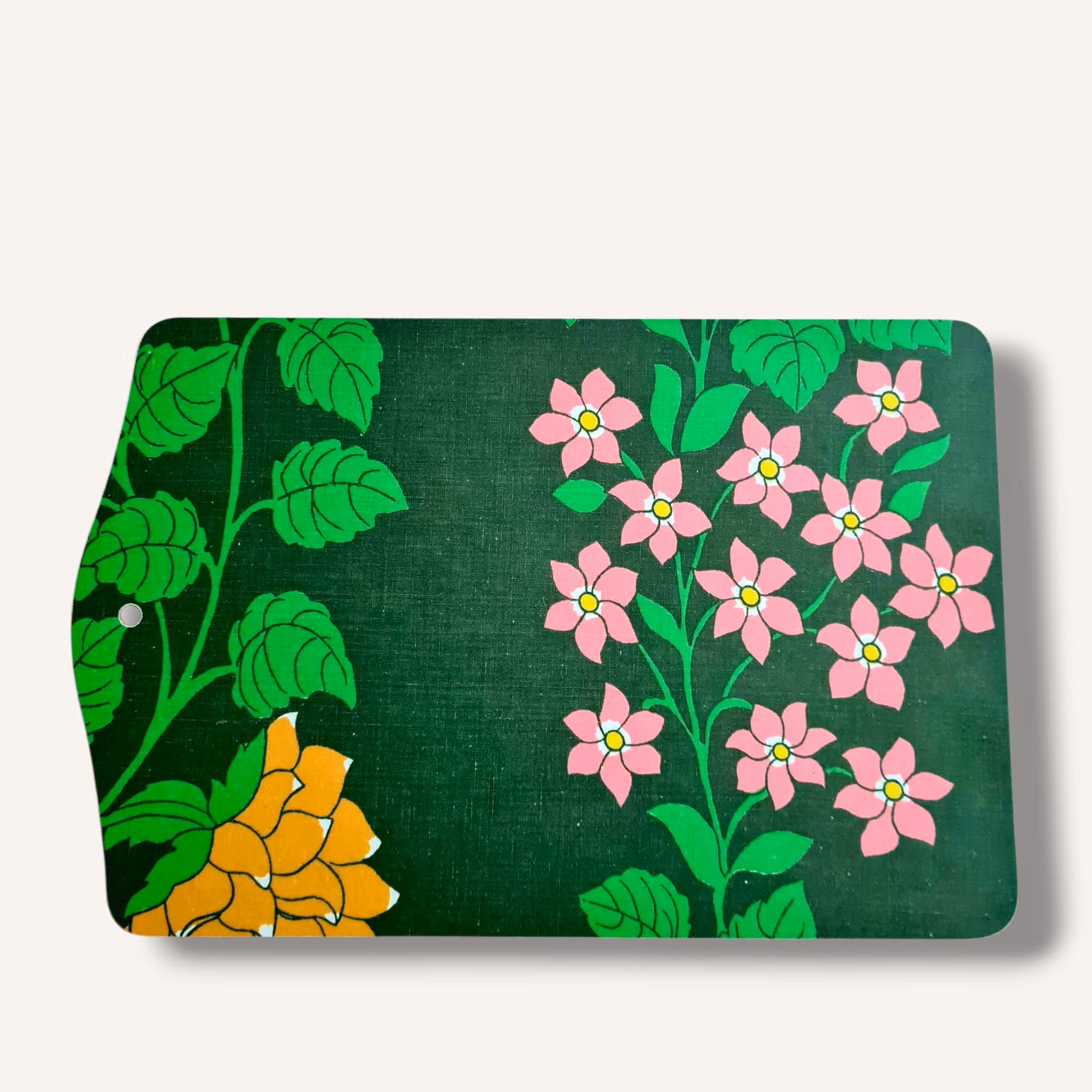 Grön skärbräda med blommönster i grönt, rosa och orange.