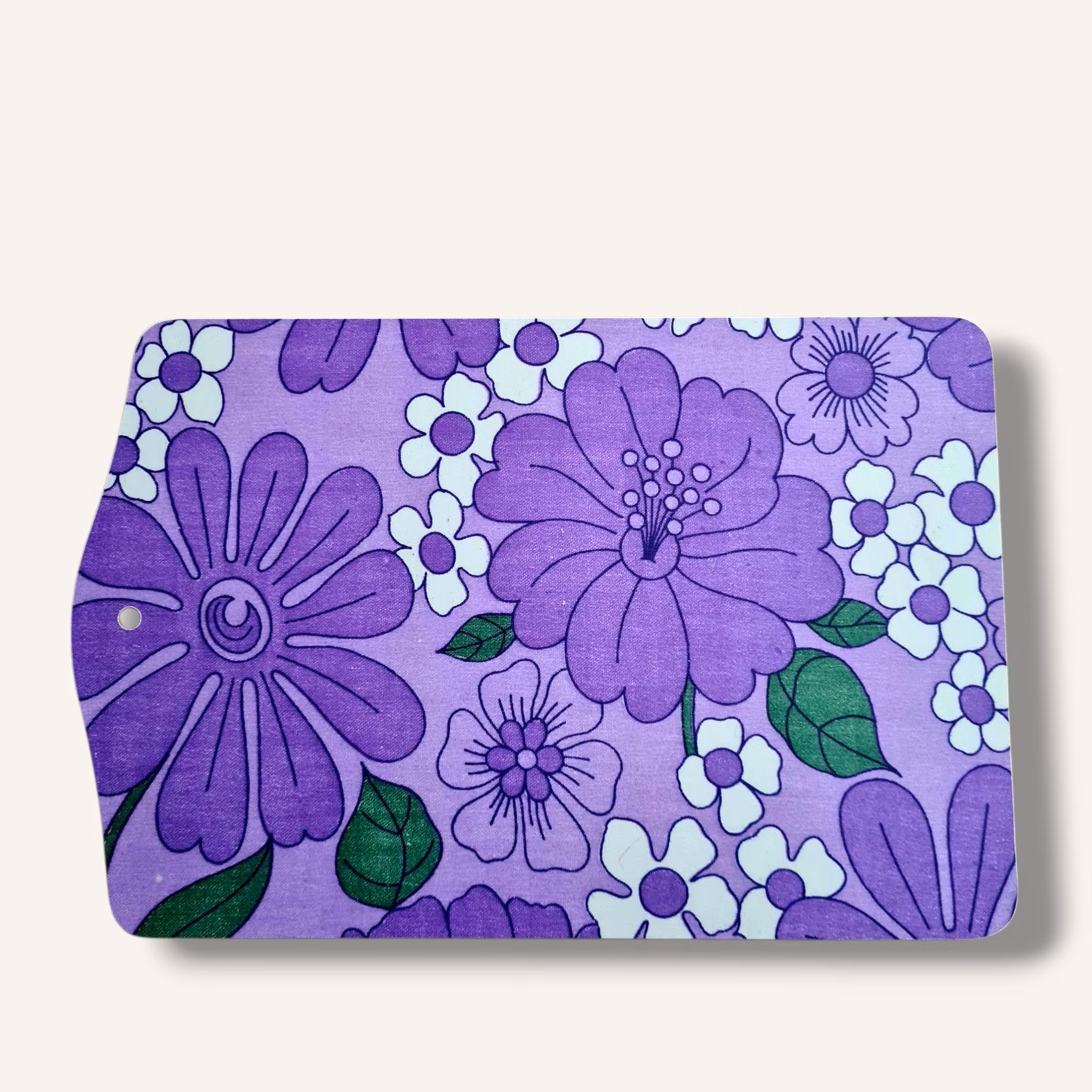 Lila skärbräda med blommönster i lila, vitt och grönt.