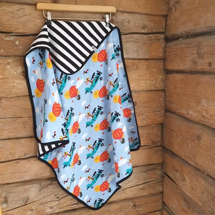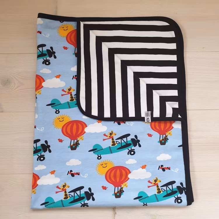 Härlig filt till barn i dubbel trikå. Ljusblå framsida med figurer och svart/vit randig baksida, svart kantband.