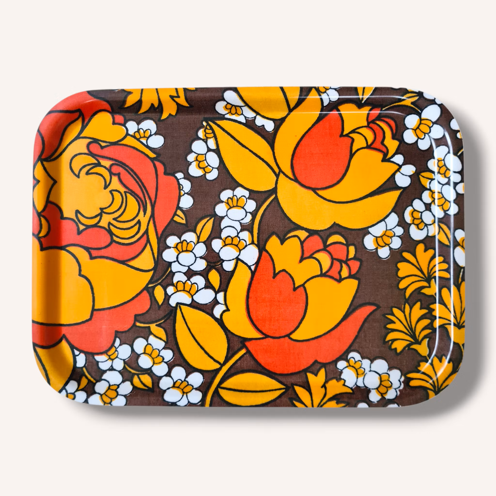 RETROBRICKA I lager. 0 kr 200 kr Retrobricka i brunt med blommönster i gult, orange och vitt.Tillverkad av återvunnet påslakan och finaste björkfanér, tillverkad i Småland.Storlek 20 x 27 cm