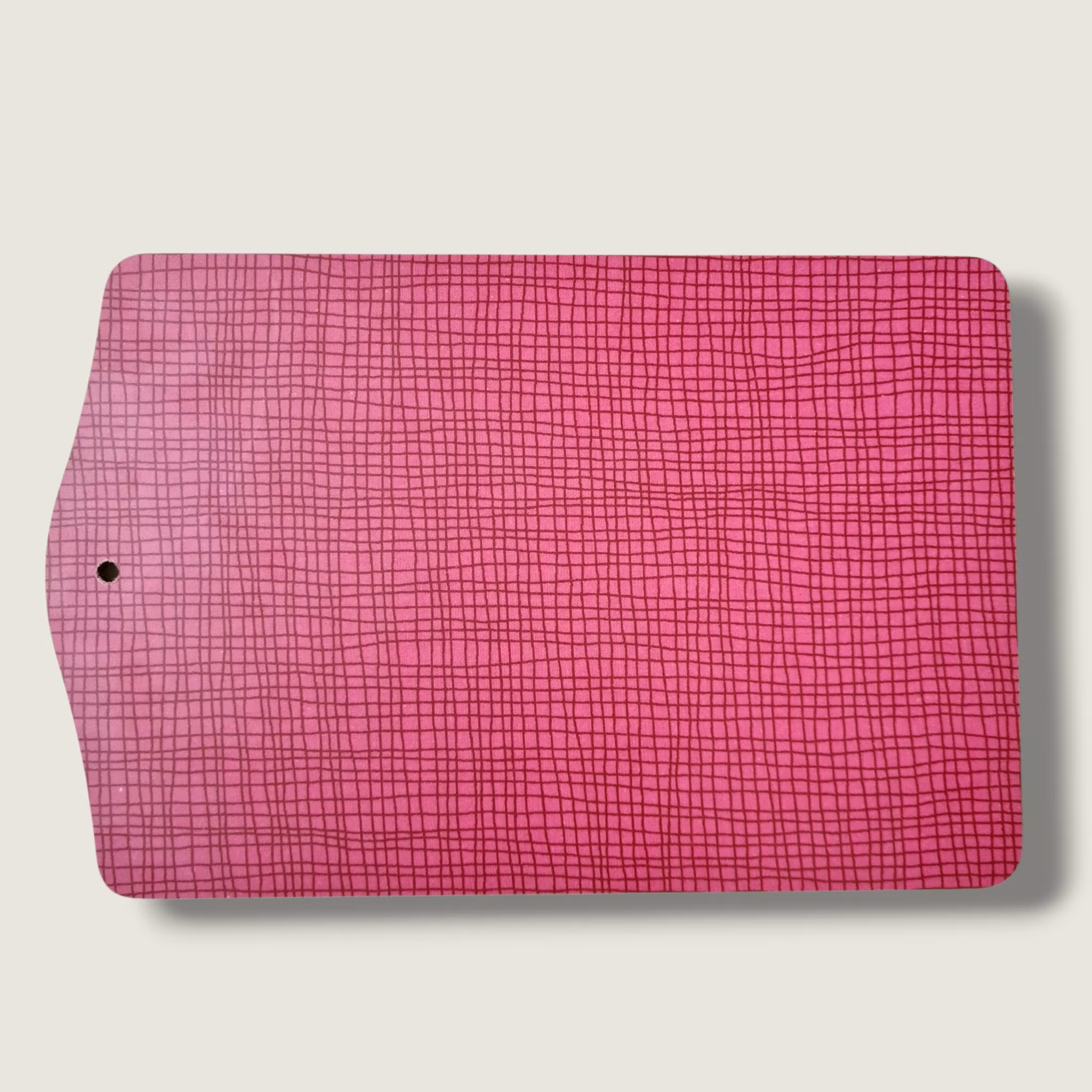 Rosa skärbräda med rutmönster i mörkare rosa.
