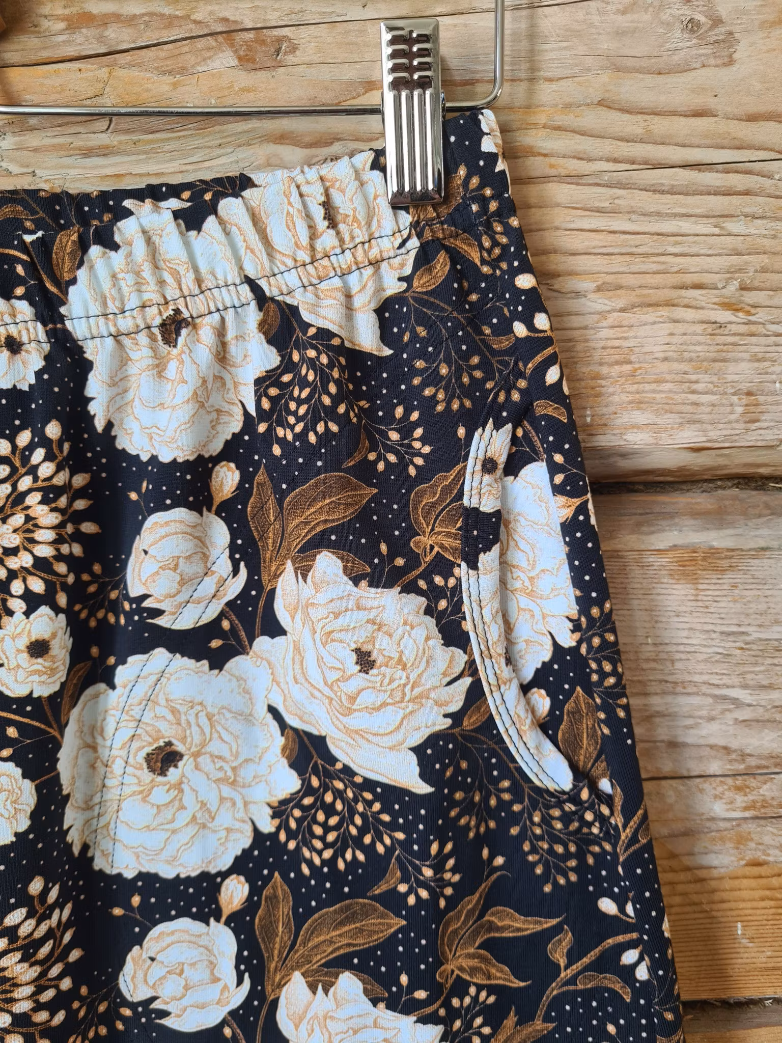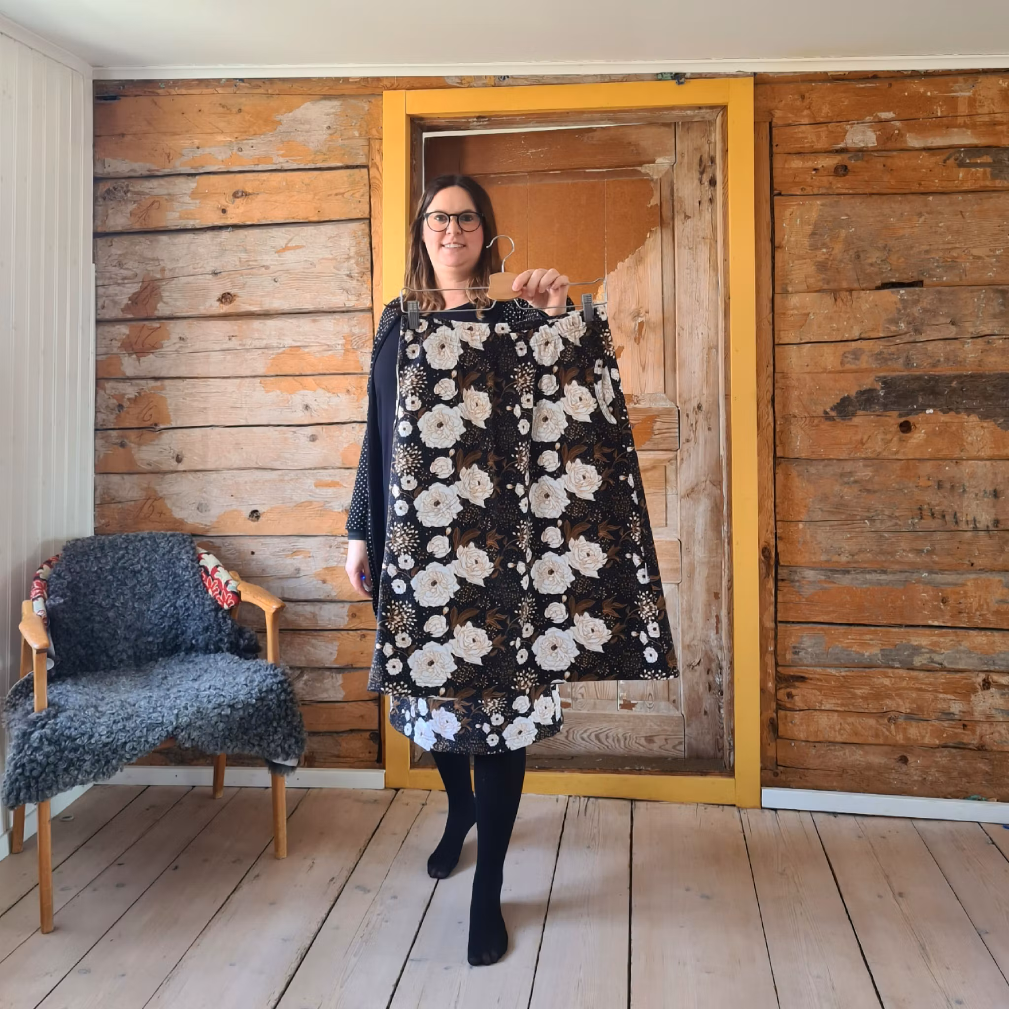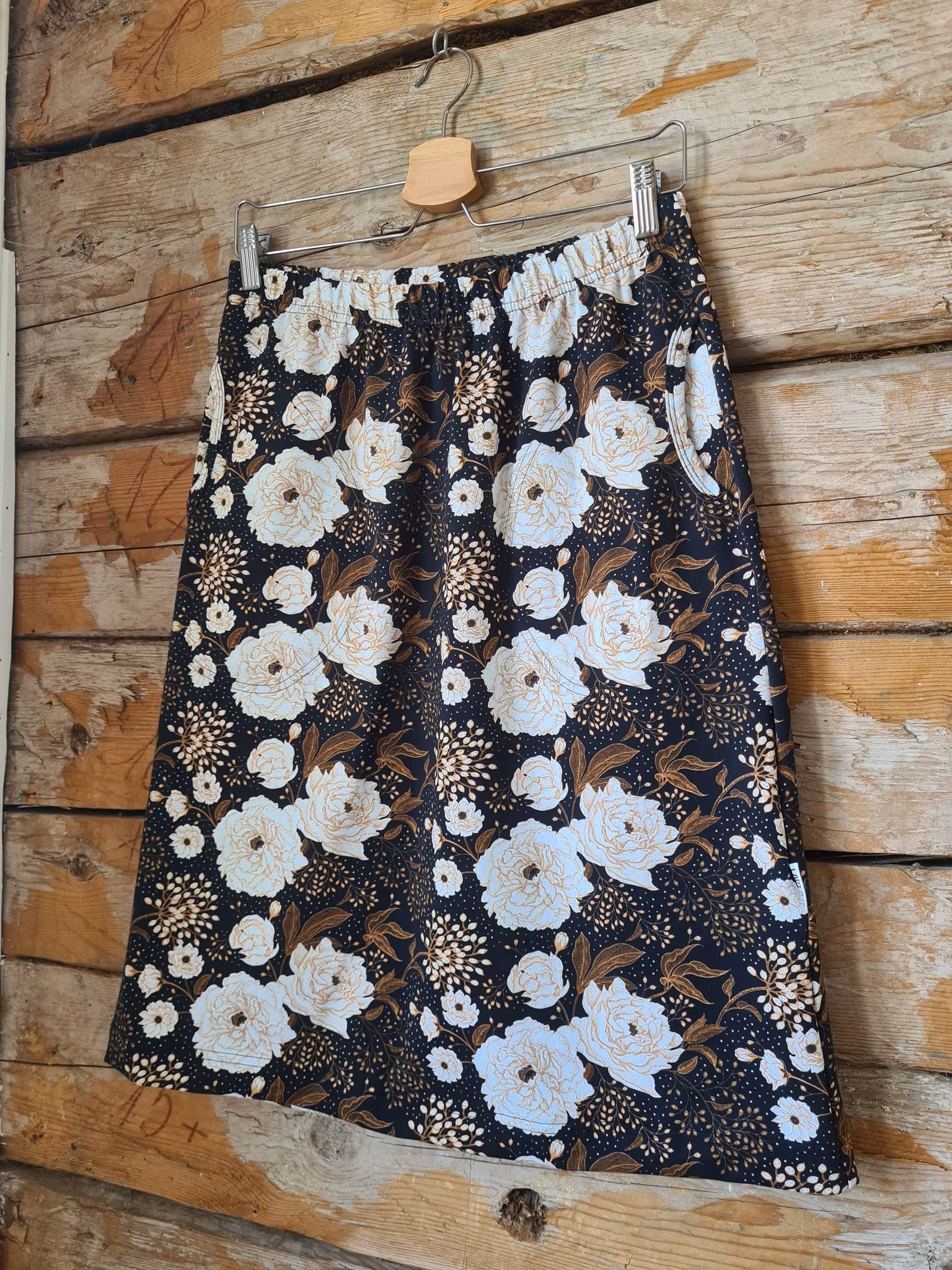 Kjolen är sydd i ett svart tyg med blommor i olika beige och bruna toner.