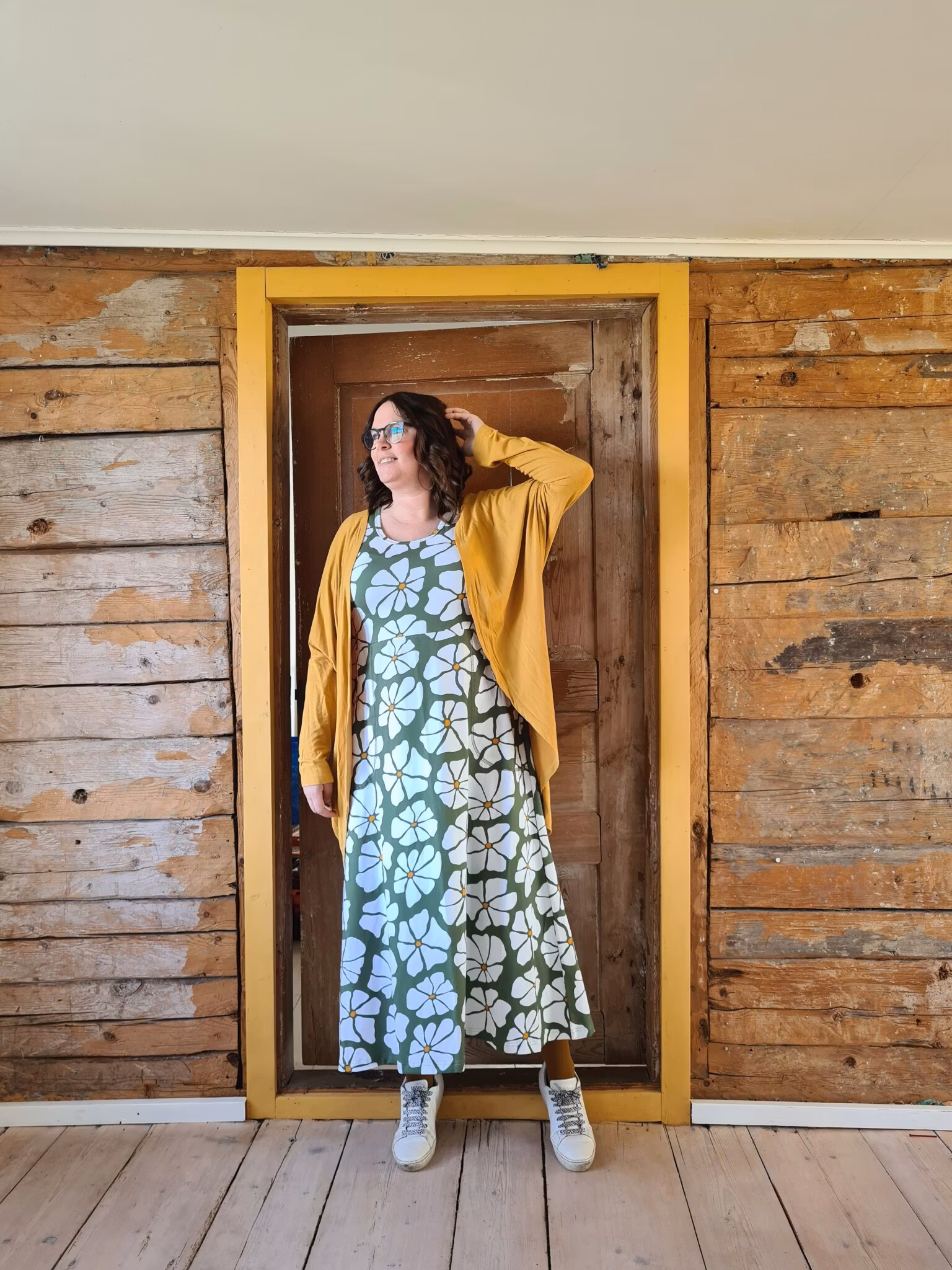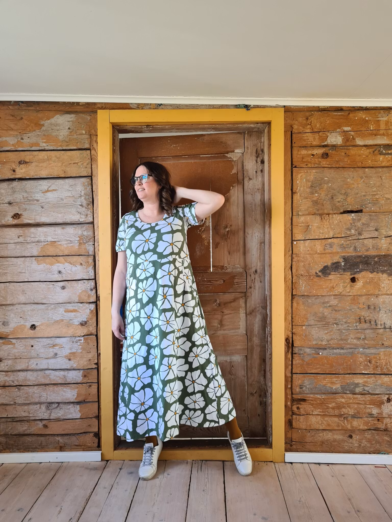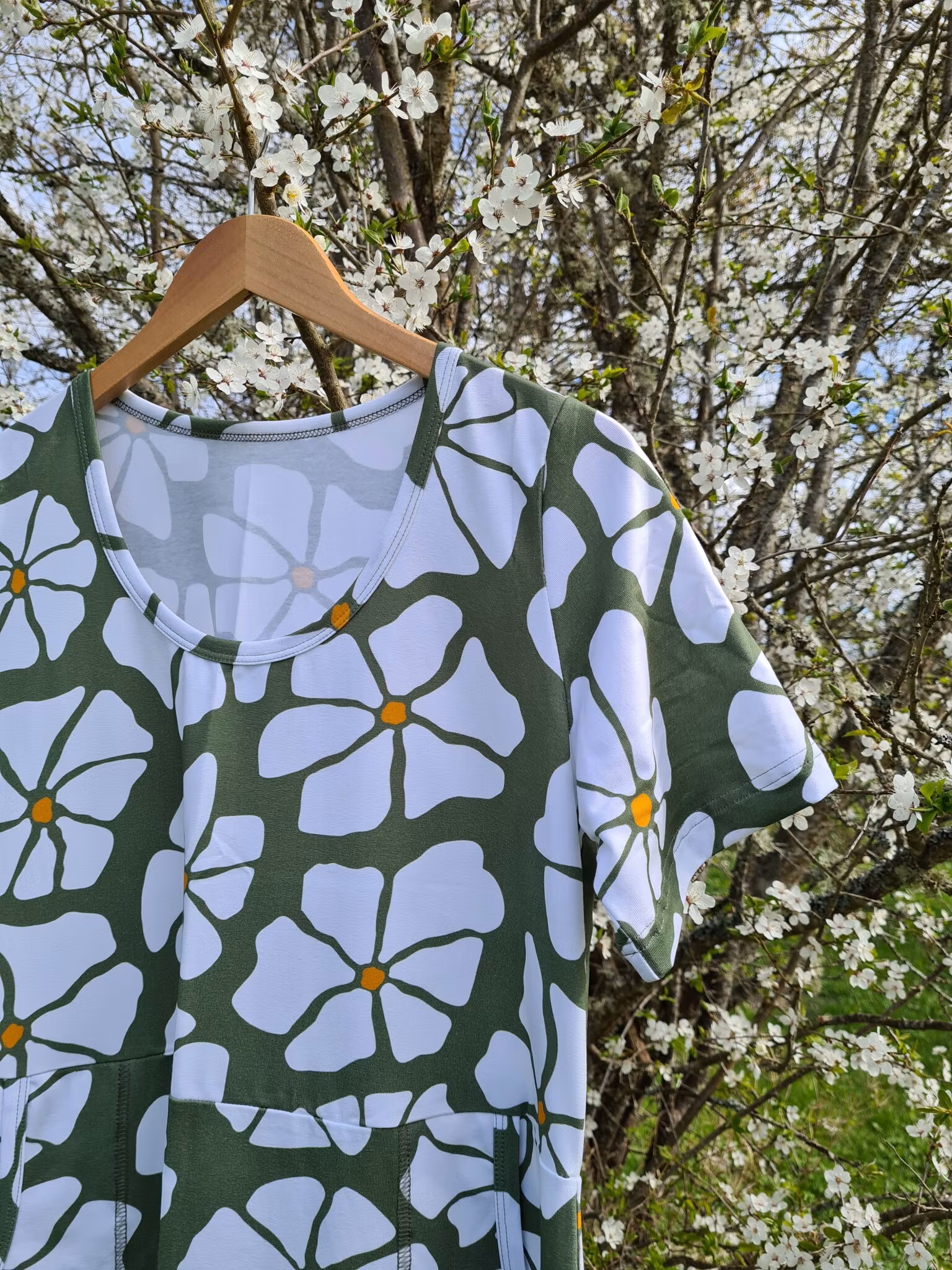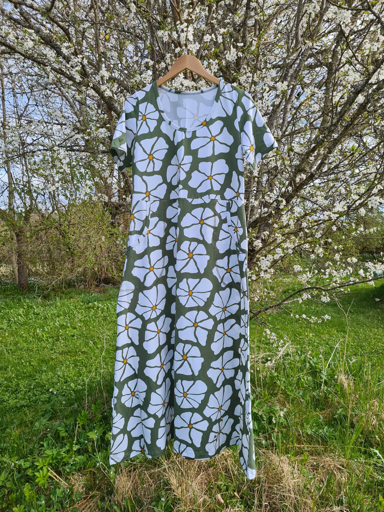 Klänningen är grön med stora vita blommor, skuren i midjan och stora fickor i samma tyg som klänningen.